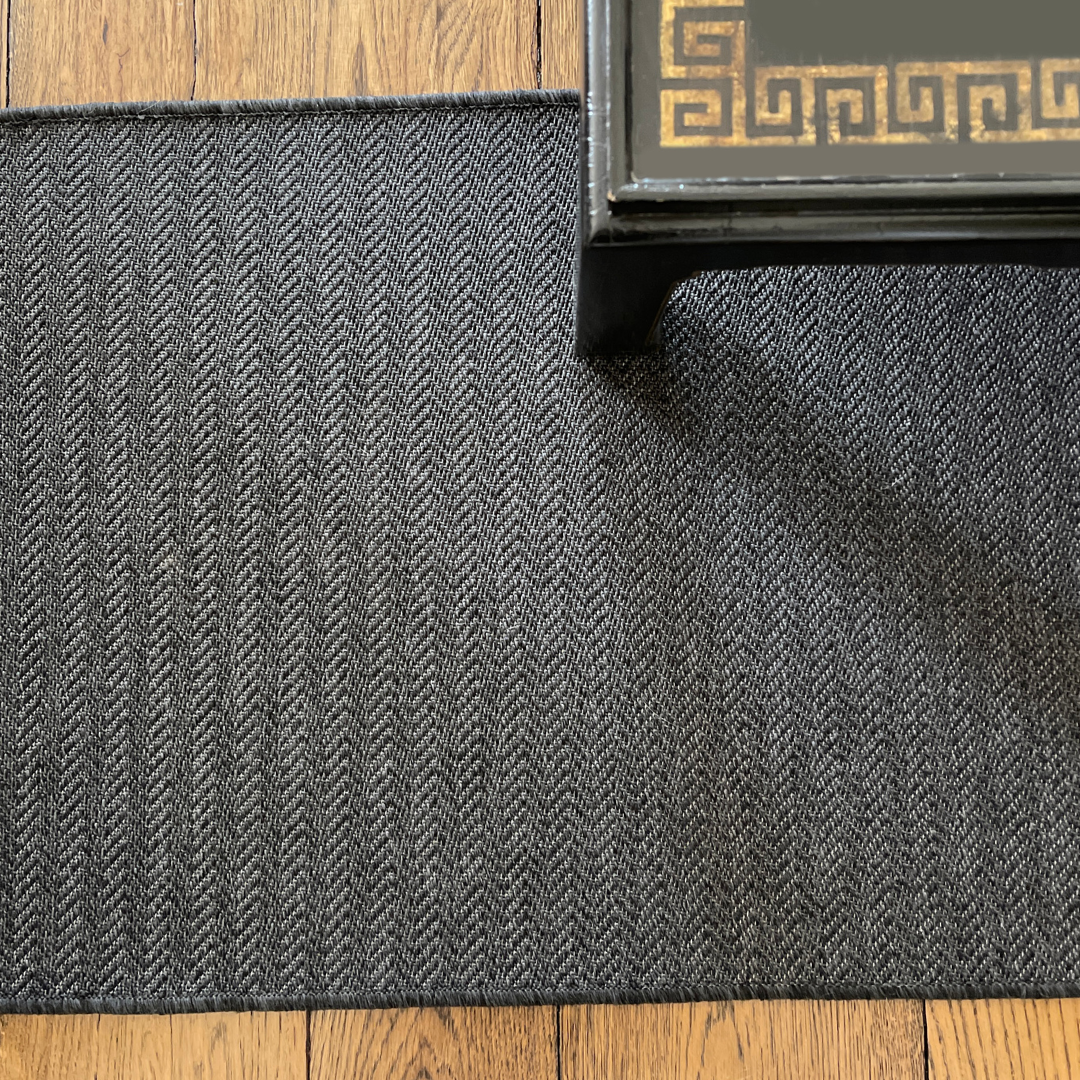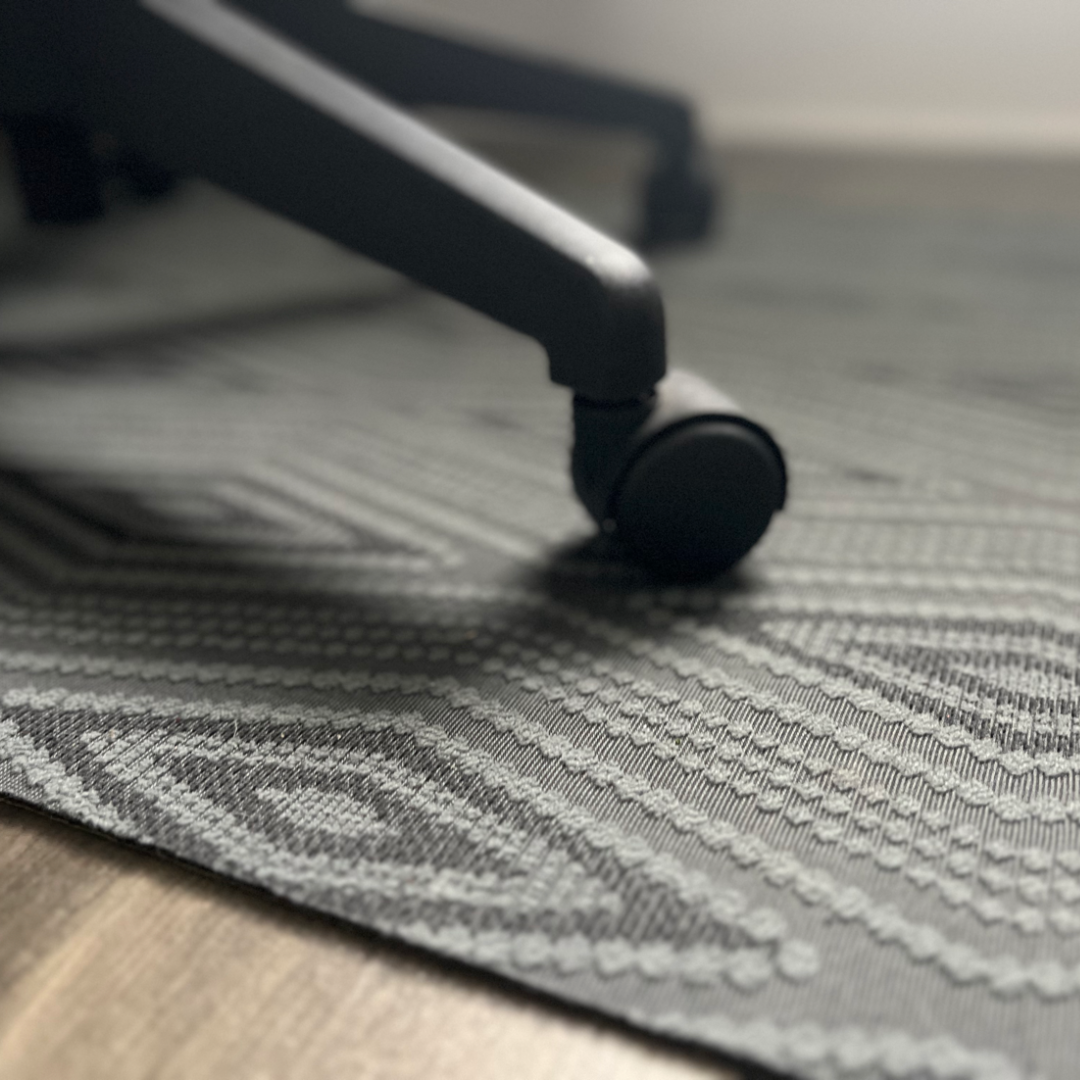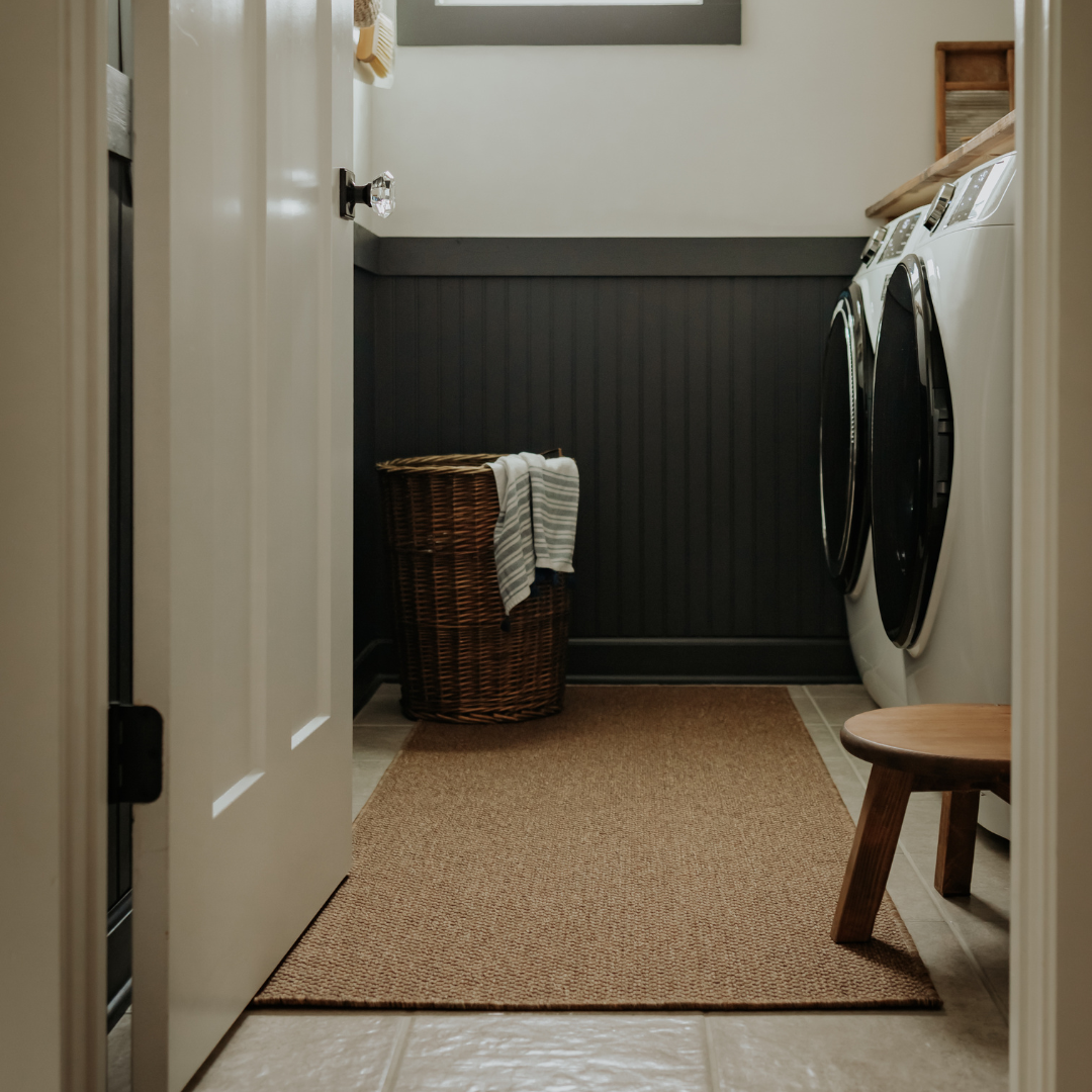 Don’t have the time or budget for a full paint refresh? Dark accent walls can completely change the feel of a space and serve as a strong foundation for a moody color palette. You can also add dark mats or rugs like The Innerweave in Chevron Dark Grey.