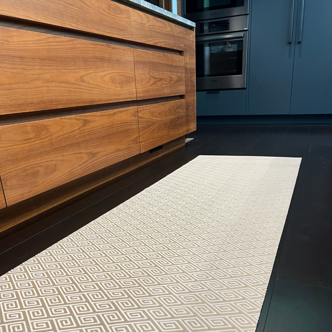When designing a moody interior, it’s not all about the dark colors and vibes. You need to create contrast to make the space feel cohesive. That can look like pairing dark furniture with lighter accent pillows or deep-hued kitchen cabinets with a contrasting floor runner. The Insider in Tigress Almond or Maze Biscotti give you a lighter, neutral feel in a dark room.