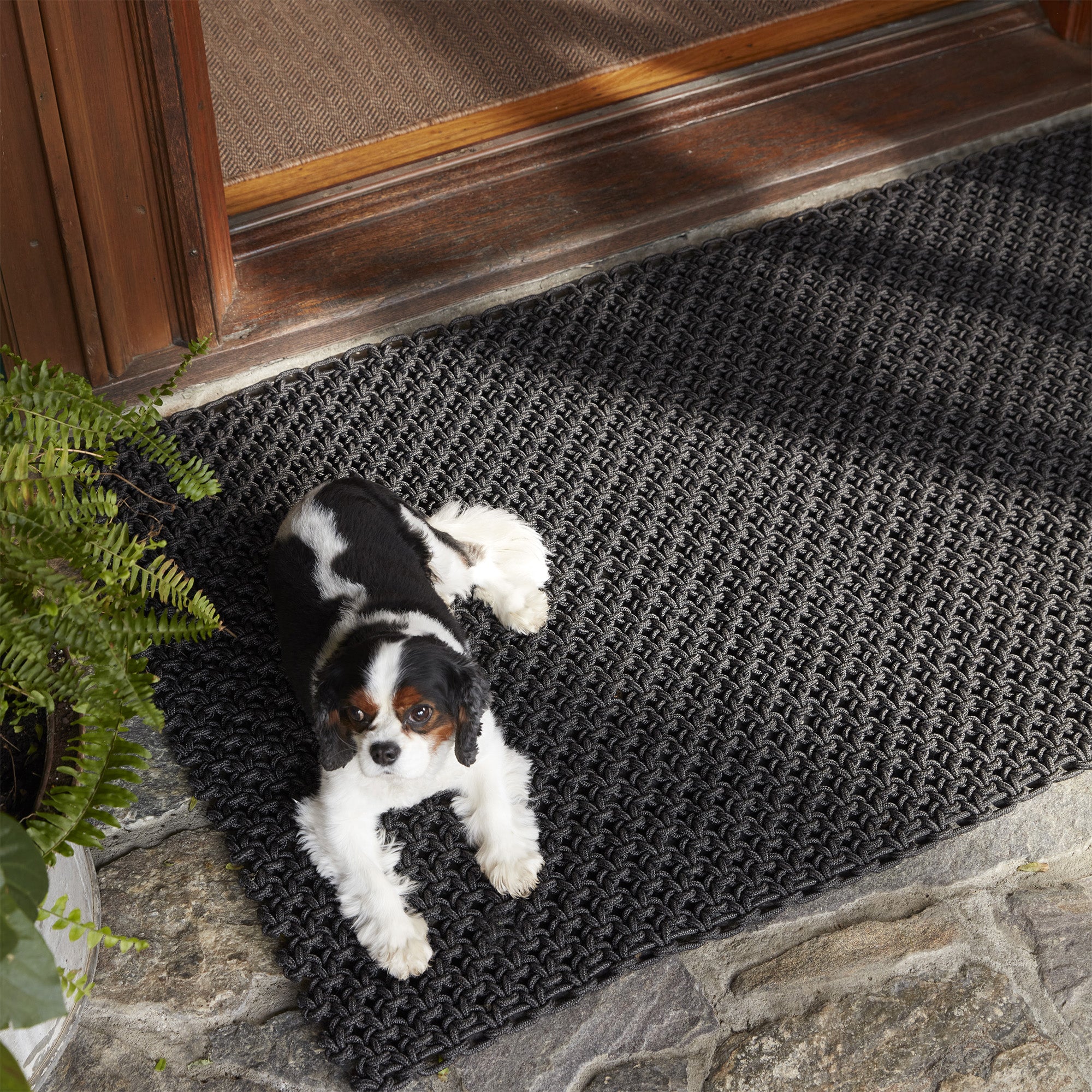Specifically designed to stay outdoors, The Porter isn’t fussy. Regularly shake out or brush off dust, dirt, and debris (a sign that those spaces between the knots are doing their job), and hose down as needed for a deeper clean. Still see mud or gunk? We recommend using mild soap and lukewarm water, then rinsing your mat and hanging it to dry. Got a stubborn spot? Mix 1 cup of hot water with ½ teaspoon of mild detergent, dab the solution on the stain with a clean cloth, then rinse and air dry.
